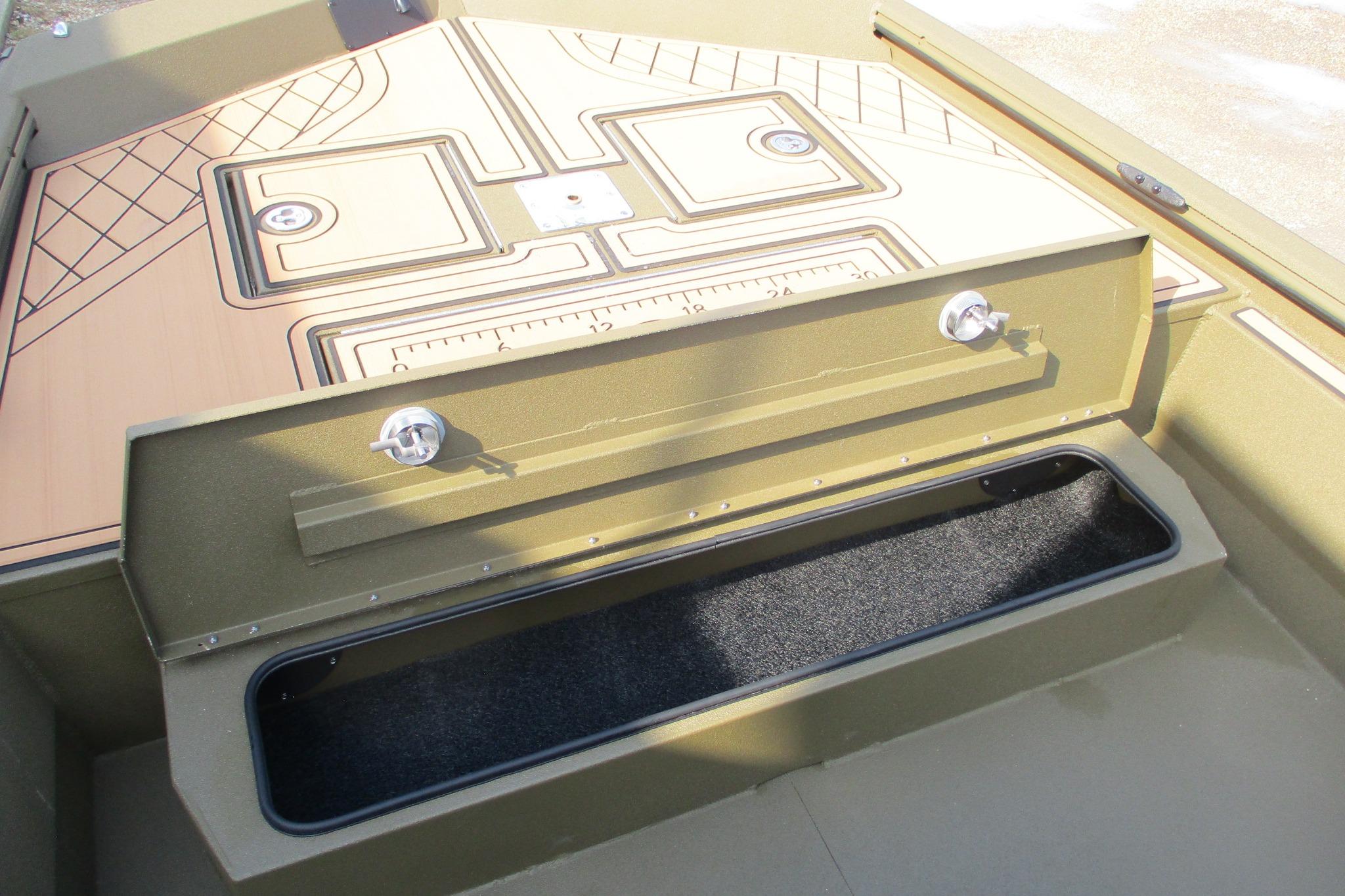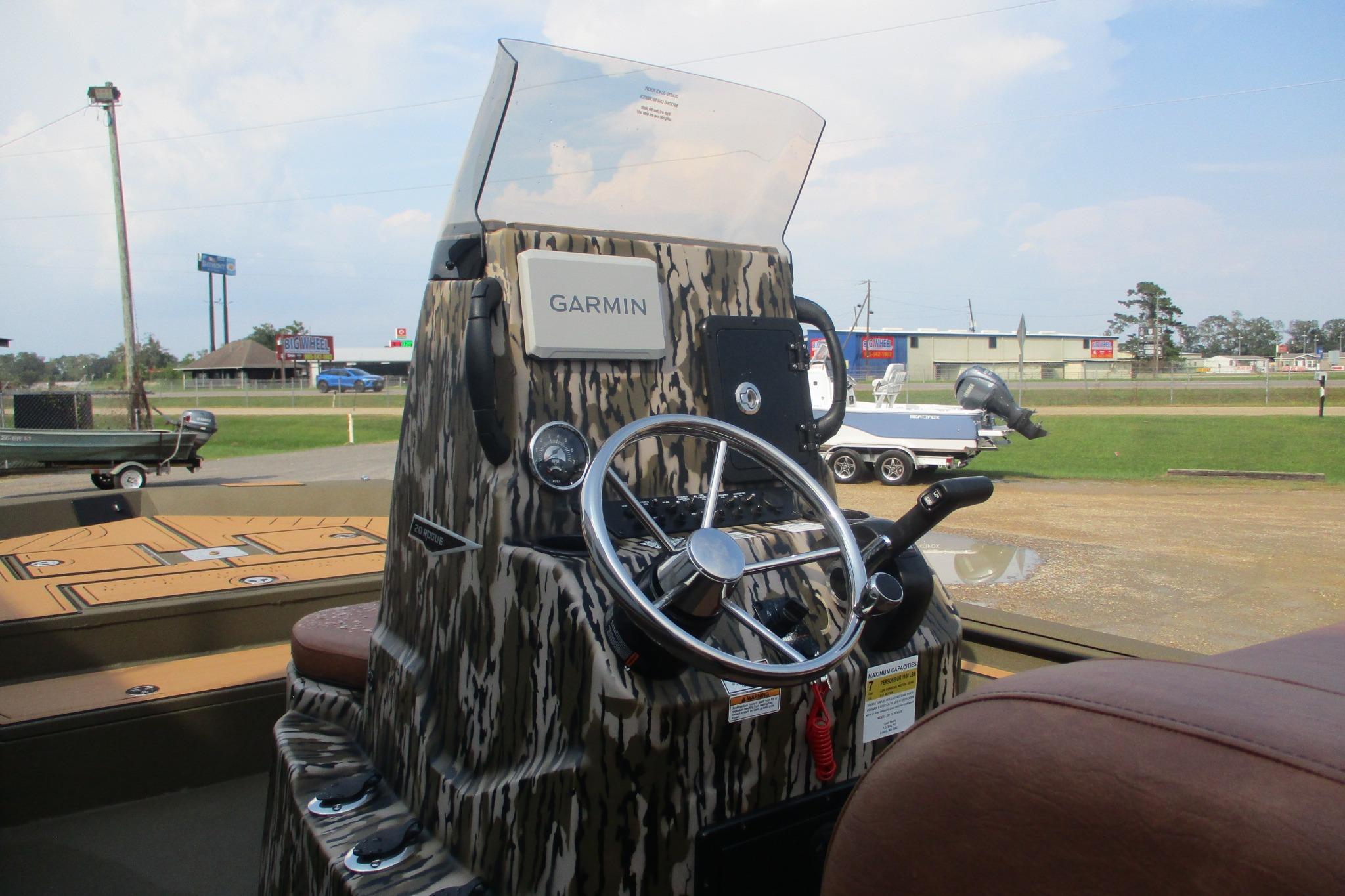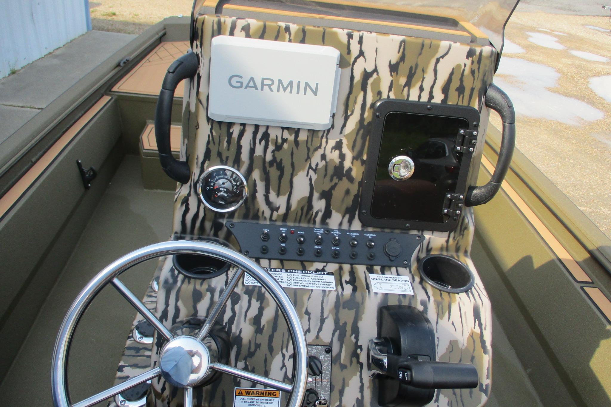 SADDLE UPHOLSTERY, BAYSTAR HYDRAULIC STEERING, OLIVE BROWN PAINT WITH MOSSY OAK GAMEKEEPER STRIPE, TEAK REFLEX FLOORING AND HELM PAD, GARMIN 7" ECHOMAP 74SV W/ GT23 DUCER, BLACK POWDERCOATING ON LEANING POST, BOW STEP WITH STORAGE, 5 DRAWER TACKLE STORAGE, DELUXE LEANING POST WITH STORAGE,